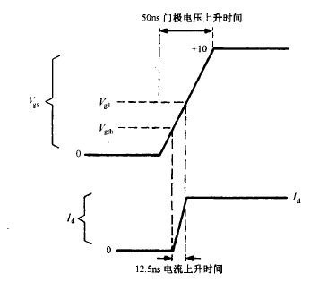 圖若柵極電壓上升時間為 50ns ,則漏極電流上升時間為 12.5ns。柵極電壓從 ov 上升到 2.5V 的闕 值電壓的時間只是一個延遲時間 。當柵極電壓達到 5    7V 時,大部分漏極電流已經建立起來。