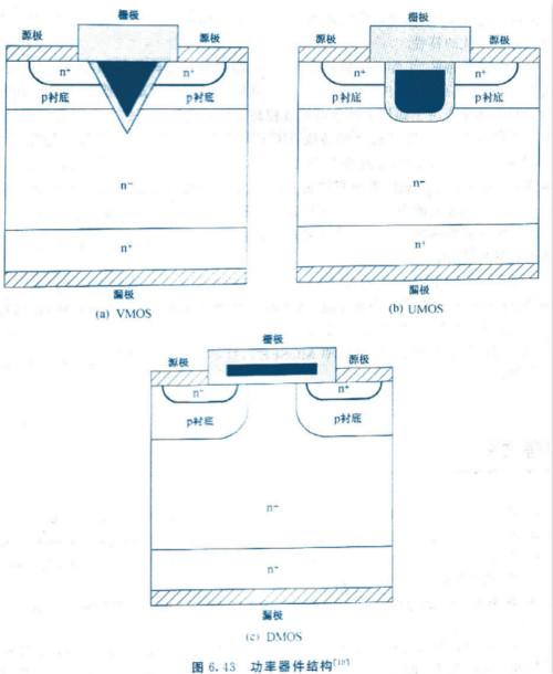 圖6.43為三個基本的功率MOSFET結構.與ULSI電路中的MOSFET器件不同的是,功率MOSFET采用源極與漏極分別在晶片上方與下方的垂直結構.垂直結構有大的溝道寬度以及可降低柵極附近電場擁擠的優點.這些特性在高功率的應用上非常重要.