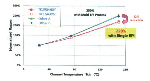 單外延工藝也使超級(jí)結(jié)MOSFET對(duì)溫度變化時(shí)有著更穩(wěn)定的性能,這有助于在更高工作溫度時(shí)維持功率變換器的效率。圖3說(shuō)明了采用最新一代技術(shù)使器件標(biāo)稱導(dǎo)通電阻在溫度變化顯著時(shí)減少,在150℃時(shí)導(dǎo)通電阻降低了12%。