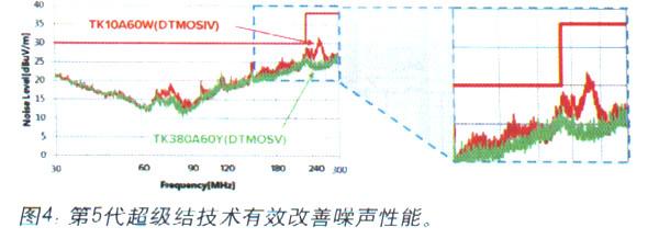 這種器件產(chǎn)生的噪聲可與其他與之競(jìng)爭(zhēng)的低EMI器件相媲美,同時(shí)該器件具有超級(jí)結(jié)技術(shù)的優(yōu)越導(dǎo)通電阻特性。圖4中比較了用于電視機(jī)電源中的PFC電路的第4代和第5代N溝道o.38m.Ω級(jí)600V器件產(chǎn)生的EMI.從結(jié)果看出新技術(shù)的采用顯著降低了干擾。
