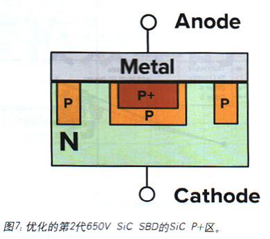 為了增加浪涌電流能力,并為電源應(yīng)用提供更強(qiáng)大的器件,我們?cè)诘?代架構(gòu)已進(jìn)行改進(jìn)并減少了調(diào)制的電導(dǎo)率(采用二極管正向電壓(VF)測(cè)試),從而實(shí)現(xiàn)更高的最大正向浪涌電流(IFSM).其中通過(guò)優(yōu)化實(shí)現(xiàn)的P+區(qū)如圖7所示。
