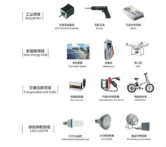 在移動數碼,LCE,HID,LED,電動車,開關電源,逆變器,節能燈等領域深得客戶認可。