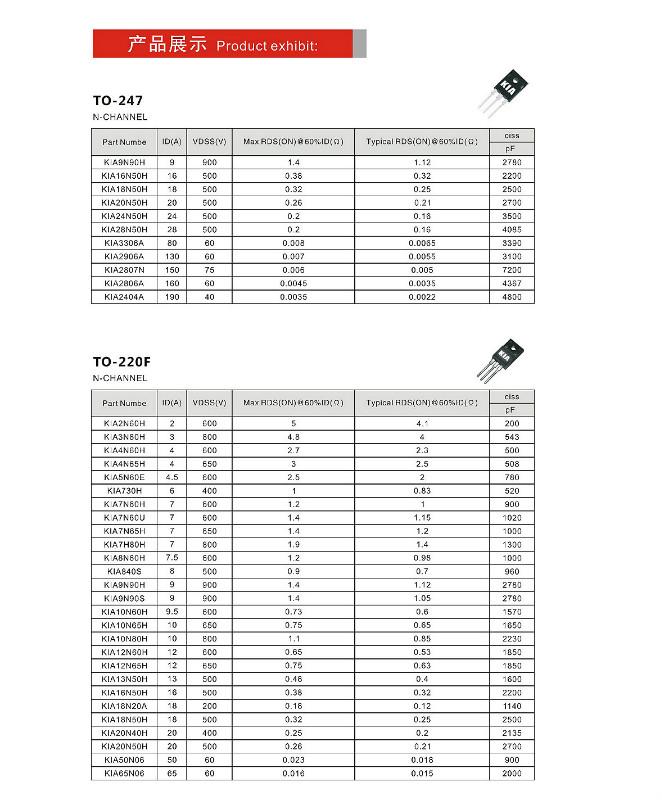 這過去的2007年,KIA一韓國技術研發人員為核心的設計團隊,成功完成最新型工藝為代表MOSFET產品的設計和生產定型,大幅度降低了產品的RDS(ON),提高客戶產品的轉換效率,并率先將該類型產品在中國市場推出,產品的相關測試數據均達到歐美同類產品,同樣這高溫可靠性和穩定性方面表現優秀。KIA半導體持續改進,永不止步期待與您一起努力向市場提供,更高性價比產品,共同提升核心競爭力。