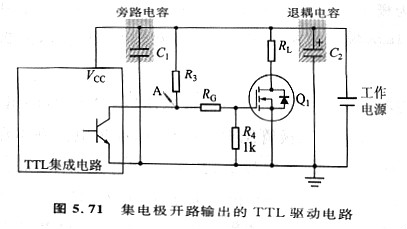 TTL集成電路的邏輯電平為5V,輸出級通常由BJT(雙極性晶體管)組成,信號普通從集電極輸出,這就是常說的“集電極開路輸出”,當然,輸出級也有采用MOSFET的,這就是“開漏輸出”。上述開路輸出方式需求外部電路配置偏置電阻,以樹立工作點,限定輸出電流(圖5.71)。