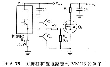 采用TTL集成電路驅動MOS另一個需求留意的問題是,工作電壓至少要高于VMOS的開啟電壓VGS(th),而且要保證圖中A點的驅動電壓高于開啟電壓。用CMOS來驅動根本上不需求思索這樣的問題,由于此類Ic能夠提供12V左右的信號電平(圖5.72)。