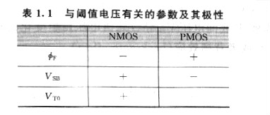式中,q是電子電荷,1.6X 10-19[C];εsi是硅的相對介電常數,εsi= 11.7;Nsub是襯底(阱)的雜質濃度。γ越大,表示襯底偏置效應越強。關于NMOS和PMOS來說,與閾值電壓有關的參數的極性是不同的,表1.1列出這些參數及其極性。