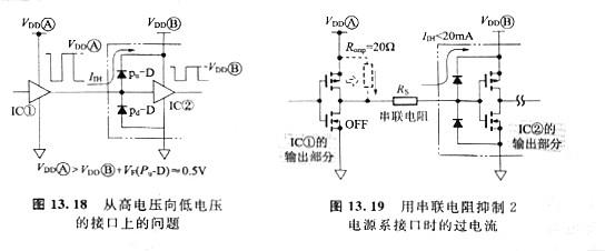 在接納IC的電源電壓比發(fā)送lC的電源電壓低的場(chǎng)所,如圖13.18所示,經(jīng)過(guò)IC②的輸入維護(hù)電路產(chǎn)牛的穩(wěn)定電流IIH會(huì)導(dǎo)致器件劣化,所以不能夠直接中止接口。針對(duì)這個(gè)問(wèn)題,如圖13. 19所示,采用給信號(hào)線插入串聯(lián)電阻,抑止電流IIH的方法。