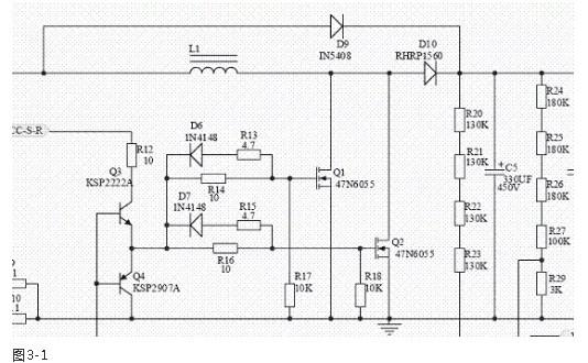 圖3-1所示;是三星V2屏等離子開關(guān)電源的PFC激勵部分。從圖中可以看出;這是一個并聯(lián)開關(guān)電源L1是儲能電感,D10是這個開關(guān)電源的整流二極管,Q1、Q2是開關(guān)管,為了保證PFC開關(guān)電源有足夠的功率輸出,采用了兩只MOS管Q1、Q2并聯(lián)應用(圖3-2所示;是該并聯(lián)開關(guān)電源等效電路圖,圖中可以看出該并聯(lián)開關(guān)電源是加在整流橋堆和濾波電容C5之間的),圖中Q3、Q4是灌流激勵管,Q3、Q4的基極輸入開關(guān)激勵信號, VCC-S-R是Q3、Q4的VCC供電(22.5V)。兩只開關(guān)管Q1、Q2的柵極分別有各自的充電限流電阻和放電二極管,R16是Q2的在激烈信號為正半周時的對Q2柵極等效電容充電的限流電阻,D7是Q2在激烈信號為負半周時的Q2柵極等效電容放電的放電二極管,同樣R14、D6則是Q1的充電限流電阻和放電的放電二極管。R17和R18是Q1和Q2的關(guān)機柵極電荷泄放電阻。D9是開機瞬間浪涌電流分流二極管。