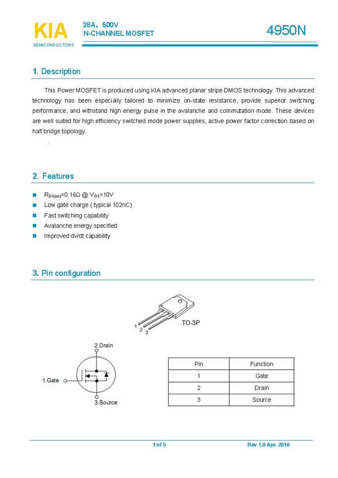 參數: ID(A): 28 BVDSS(V): 500 RDS(ON): 0.16 Qg(nC): 102 Package: TO-3P