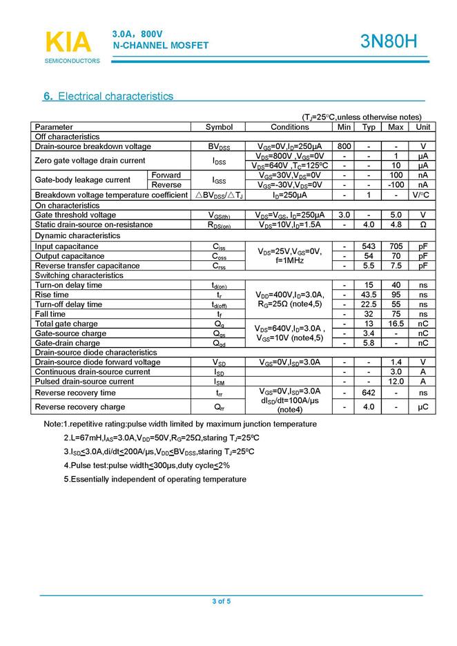 參數: ID(A): 3 BVDSS(V): 800 RDS(ON): 0.0048 Qg(nC): 13 Package: TO-220F