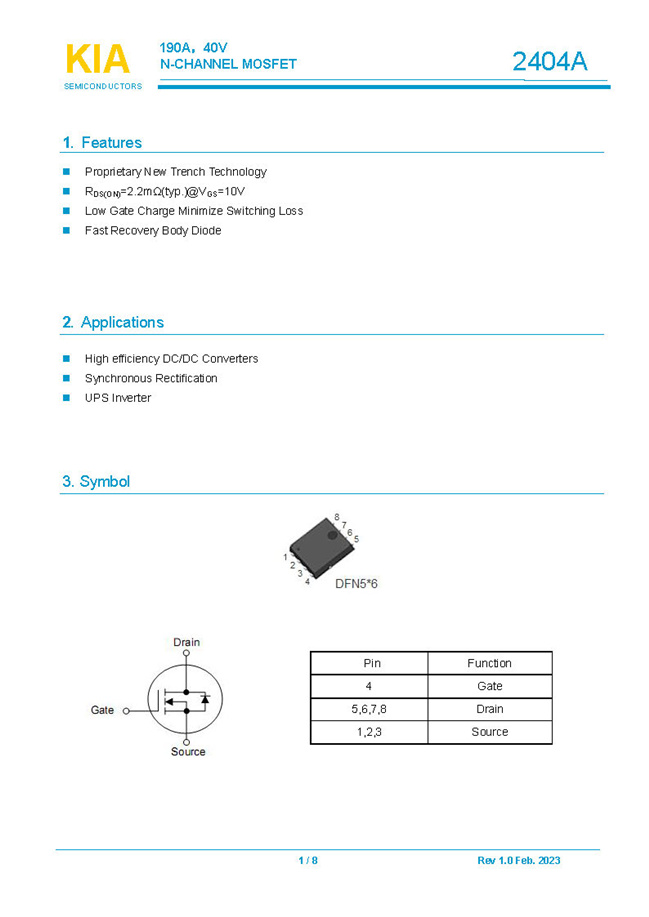 參數(shù): ID(A): 190 BVDSS(V): 40 RDS(ON): 2.2 Qg(nC): 94 Package: DFN5*6
