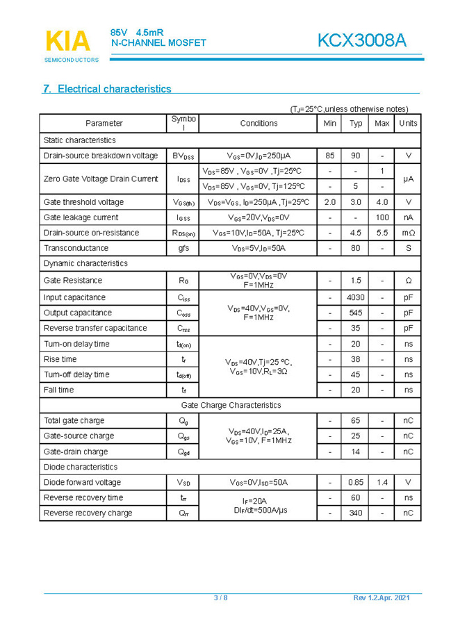 參數(shù): ID(A): 120 BVDSS(V): 85 RDS(ON): 4.5mΩ Qg(nC): 65 Package: TO-252.TO-263.DFN5*6