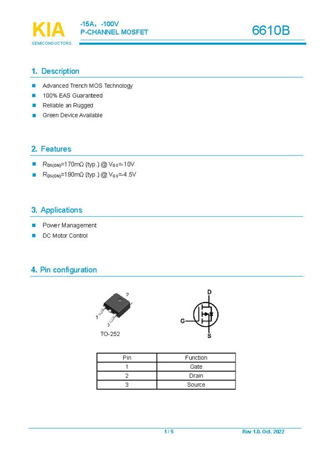 參數: ID(A): -15 BVDSS(V): -100 RDS(ON): 170mΩ Qg(nC): 19 Package: TO-252