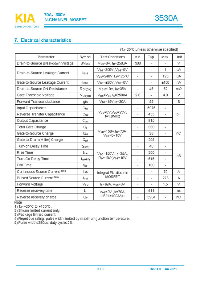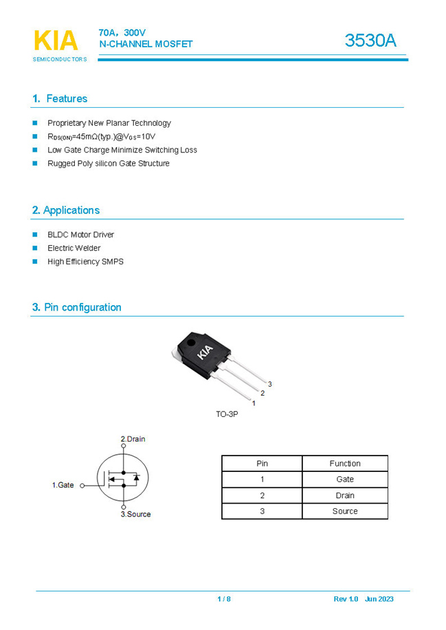 參數: ID(A): 70 BVDSS(V): 300 RDS(ON): 45mΩ Qg(nC): 380 Package: TO-3P