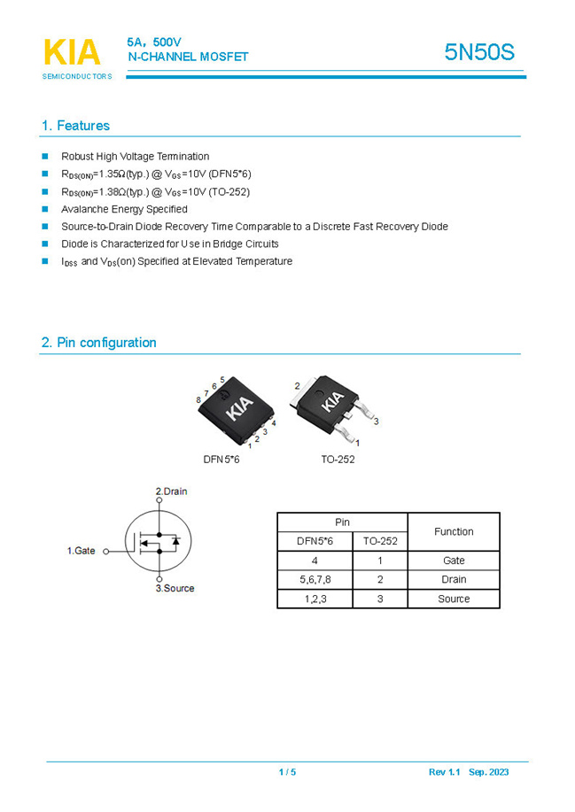 參數: ID(A): 5    BVDSS(V): 500    RDS(ON): 1.38mΩ    Qg(nC): 12    Package: TO-252.DFN5*6