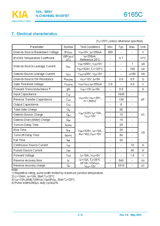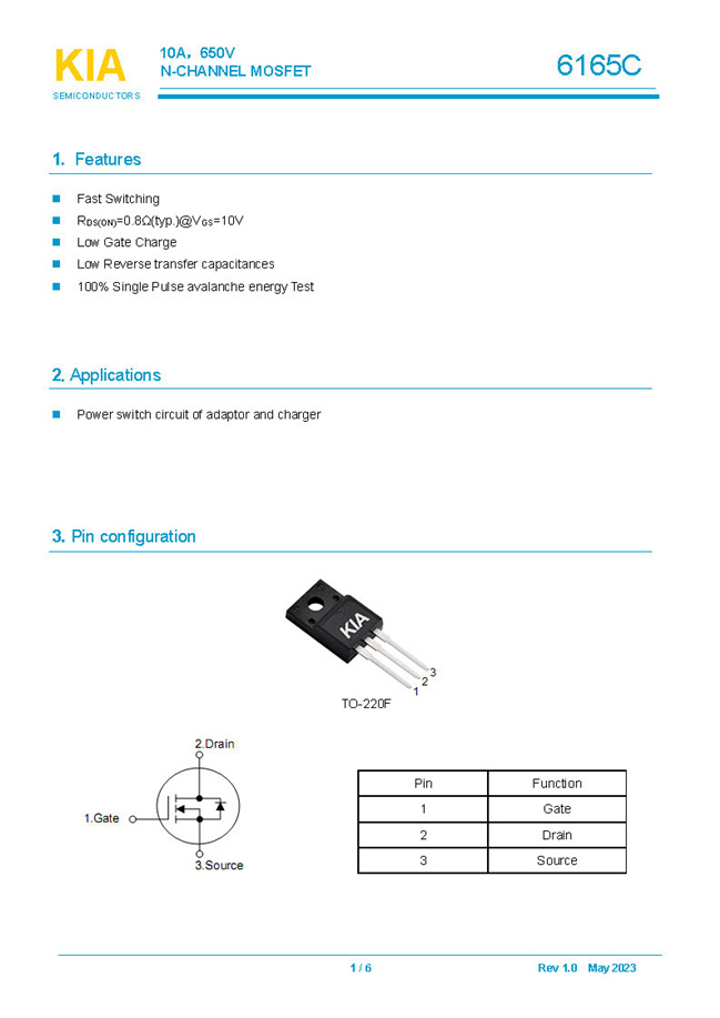 參數: ID(A): 10 BVDSS(V): 650 RDS(ON): 0.8Ω Qg(nC): 35 Package: TO-220F