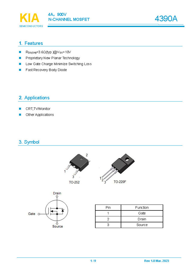 參數(shù): ID(A): 4 BVDSS(V): 900 RDS(ON): 3.6Ω Qg(nC): 15 Package: TO-252.TO-220F