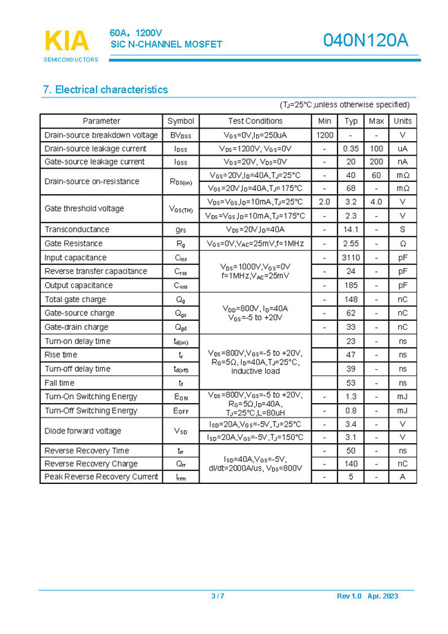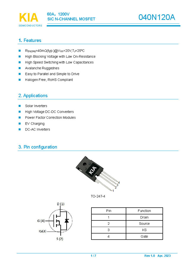 參數: ID(A): 60 BVDSS(V): 1200 RDS(ON): 40mΩ Qg(nC): 148 Package: TO-247-4